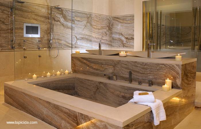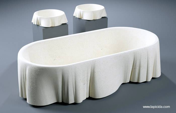 | Bañera y lavabos de piedra fina diseñados como manteles |