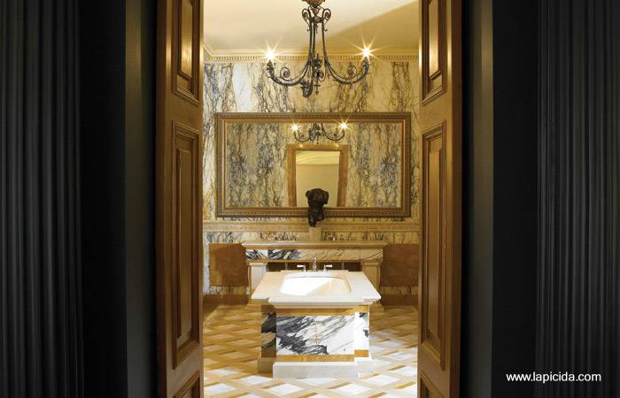En las piedras es necesario vigilar la elección del color, de sus vetas y el pulido. Aquí, en las fotos se ve material de mármol fino en los pisos, paredes y dándole forma a los sanitarios.