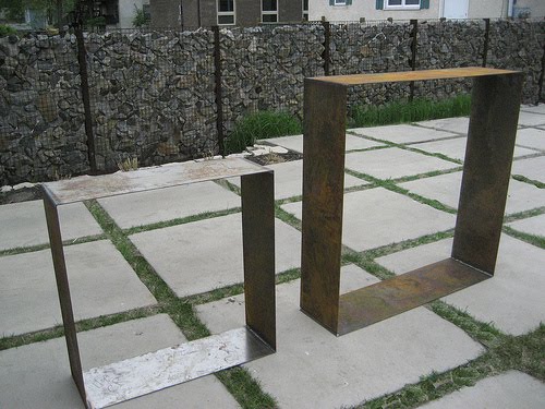 Para definir canteros adelante se han fabricado cajas sin fondo de acero luego oxidado y en el patio interior se usó como recurso decorativo una caja vacía que puede verse claramente en una de las fotos.