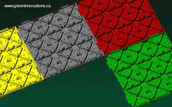 Las formas de los elementos que vemos en estas imágenes son modulares, piezas que se encastran entre si haciendo su instalación muy simple. De peso liviano, los paneles plásticos son fáciles de transportar y también de apilar para su almacenamiento. Esta serie, en las fotos, es de la marca Green Innovations, se trata de un producto canadiense.