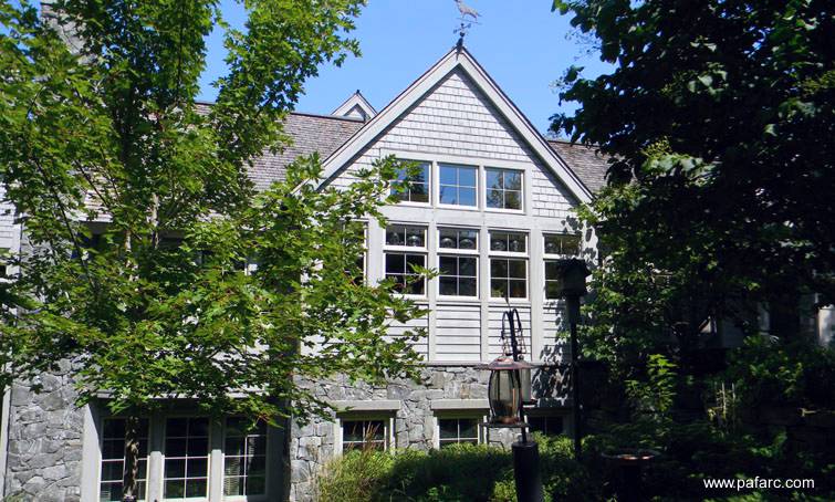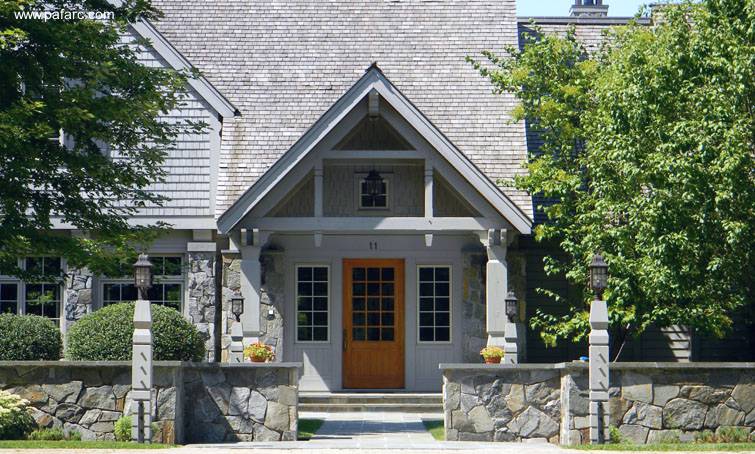 Residencia norteamericana de piedra y madera con espíritu de cabaña.