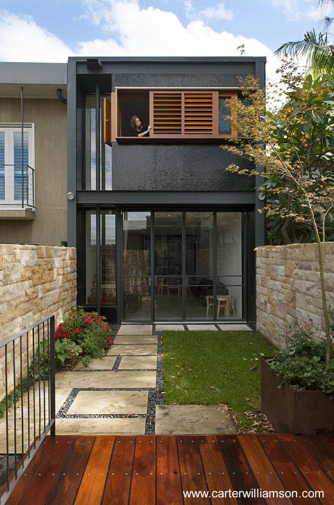 Se trata de una residencia urbana en Australia ubicada entre medianeras, en una serie de unidades similares, el lote es angosto y profundo, desnivelado. Esta arquitectura de tiras de casas angostas (terrace houses) es herencia de Inglaterra, donde se usó desde el siglo 16. En este caso la residencia fue completamente reconstruida moderna.