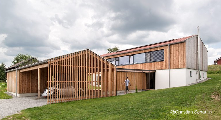 La primera imagen arriba muestra el frente de la casa a la calle, es una estructura moderna con techos inclinados invertidos.