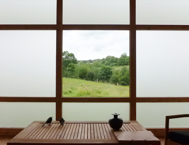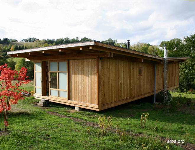 Obra del estudio ARBA - del año 2012, ubicada en Lisieux, presupuesto de 136 mil euros, hay una página en su sitio de Internet sobre esta moderna económica cabaña pequeña de madera en la pradera.