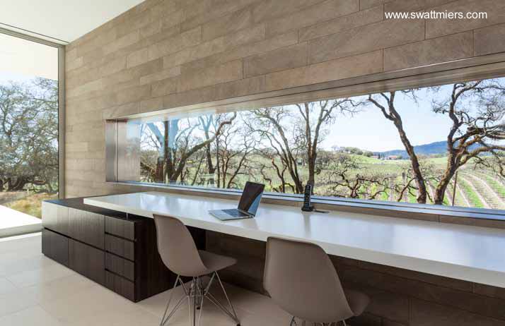 Nombre del proyecto Retrospect Vineyards Residence, casa de campo en un viñedo de Windsor, California, obra del estudio Swatt Miers Architects, fotos de Russell Abraham. El enlace lleva a la página del proyecto en el sitio web del arquitecto.