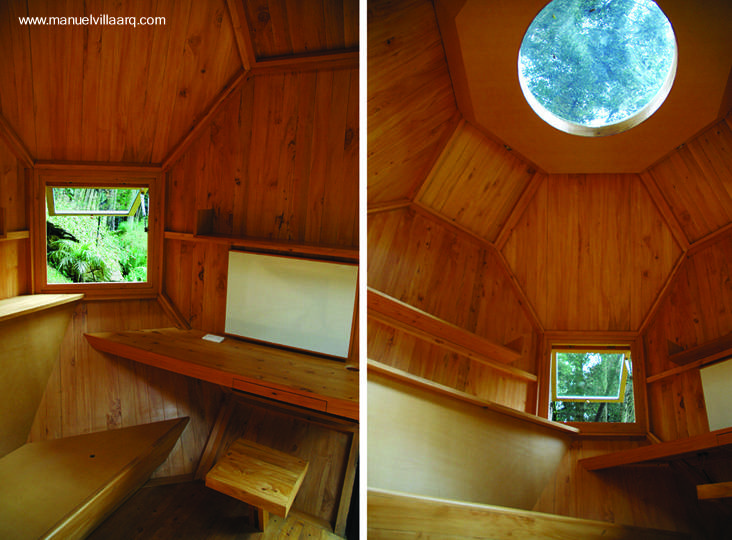 Observe la altura de la plataforma de madera elevada, despegada del suelo, y el puente con escalera para el nivel superior de la casa.
