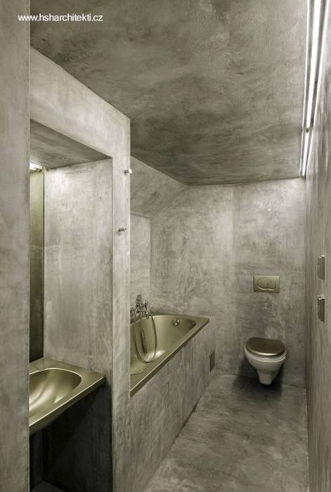 Por adentro la pequeña casa es bitonal: pisos verdes y paredes gris cemento de terminación simple o rústica. El baño es minimalista, completamente gris de piso a techo y destaca por los sanitarios de acero inoxidable, aunque el inodoro adosado a la pared es cerámico con tapa de acero.