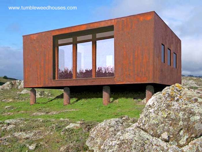 Cabaña cúbica pequeña cubierta de metal oxidado