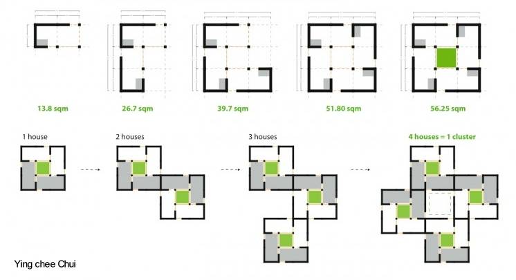 Cada una de estas casas económicas está basada en la repetición por cuatro de la unidad modular de construcción, e incluso cada unidad, forma de L, puede servir para configurar un albergue básico pequeño, de utilidad por ejemplo en situaciones de desastre natural.