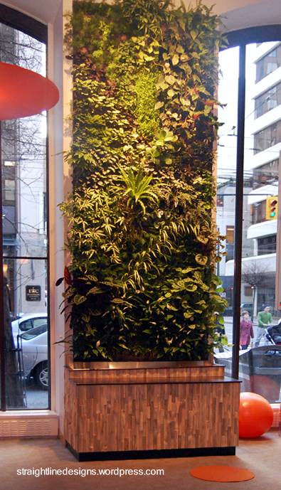 En la foto que sigue, el jardín vertical está ubicado sobre una ancha columna del interior de un edificio moderno.