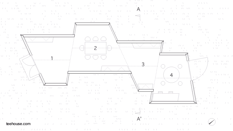Hay tres cortes y desplazamientos del volumen arquitectónico, así quedan cuatro sectores que están corridos  con respecto al eje longitudinal de la planta. No es una vivienda, sirve para un servicio como parador en el camino, del modo como lo hacen los pabellones de uso en lugares públicos.
