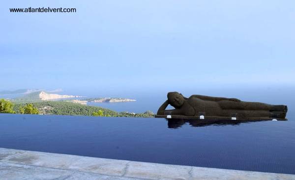 Los bordes de las piscinas modernas se identifican por su terminación desbordante, borde infinito, y también por un agregado singular, como en el ejemplo que sigue, una escultura relacionada con la cultura oriental.