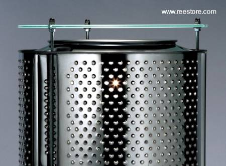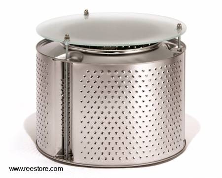 Esta mesa de café está hecha con una parte de un lavarropas. Se trata de una idea no convencional ya que a nadie se le ocurre usar una parte de máquina de lavar la ropa para construir una mesa. Este moderno mueble es de baja altura y diámetro reducido, lleva una tapa de cristal grueso translúcido que va sujeta por varillas de acero inoxidable, el material del tambor de centrifugación de la lavadora desmantelada.