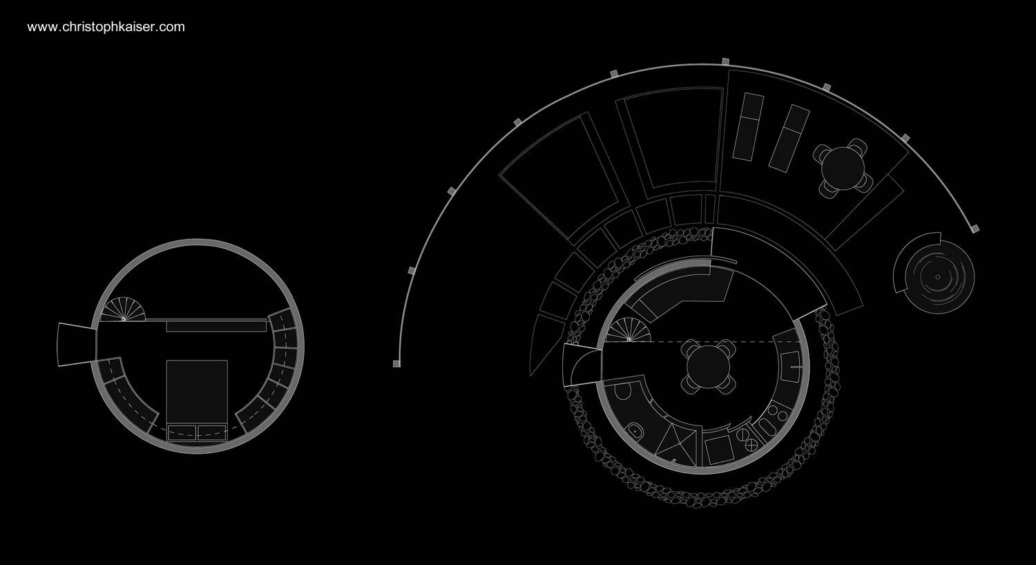 El interior de esta casa redonda es de tipo loft con el dormitorio sobre la media luna de la planta superior.