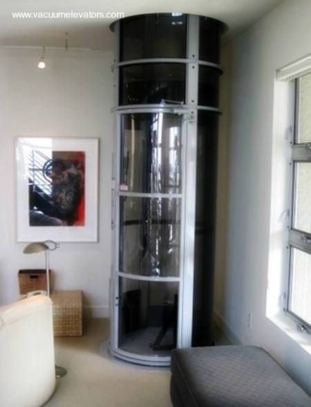 El ascensor neumático unifamiliar combina una estructura vidriada con la forma de cilindro en posición vertical con una cabina, el carro vertical que eleva y baja personas por succión de aire y gravedad respectivamente.