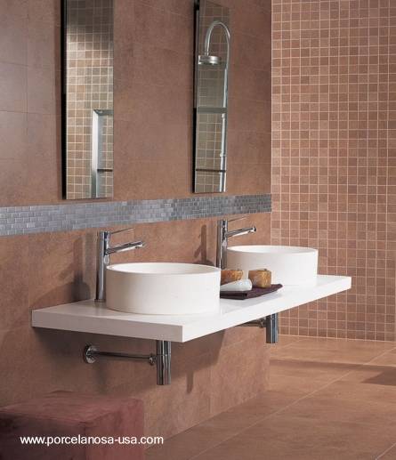 Son azulejos con textura de fina y delicada terminación pulida y brillante. El primero en las fotos está compuesto de pequeños cuadrados en la superficie de metal de la pieza y como puede verse en la imagen sirve para dar acento a las paredes de un baño estilo Contemporáneo. También estos azulejos metálicos otorgan al ambiente un toque de lujo.