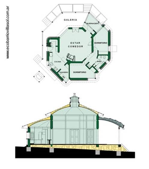 En la siguiente ilustración se pueden ver los planos de una de las casas ecológicas de la eco villa cordobesa en Argentina.