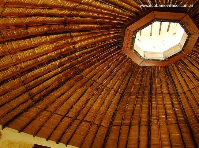 | Techo de cañas radiadas a la vista, atadas, cúpula con óculo central |