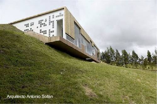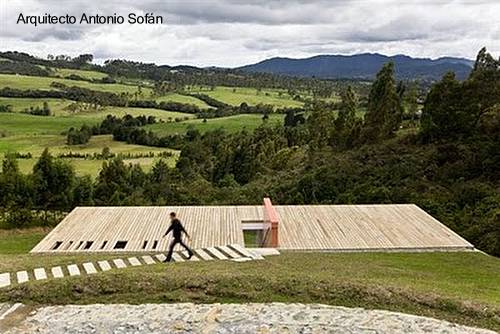 Desde arriba, aproximándose a ella parece una empalizada tumbada con una puerta abierta. Esta localizada en Santa Elena de Antioquia, Colombia. La superficie cubierta es de 1.000 pies2 y está construida con materiales del lugar y sustentables.