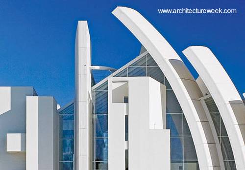 Arquitectura del siglo 21 blanca inmaculada gracias a una innovación, con sus altas velas de concreto ganando las alturas del cielo.